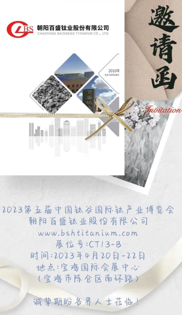 “第五屆中國鈦谷國際鈦產(chǎn)業(yè)博覽會(huì)”將于2023年4月20日-22日在寶雞國際會(huì)展中心舉辦,朝陽百盛鈦業(yè)作為參展商,用第一視角直擊全球規(guī)模最大的鈦行業(yè)盛會(huì)!</p> <p style="text-align:center"><img alt="" src="/userimages/images/222.jpg" /></p> <p style="text-align:center"> </p> <p>展位號(hào):CT13-B</p> <p>時(shí) 間:2023年4月20日-22日</p> <p>地 點(diǎn):寶雞國際會(huì)展中心</p> <p> (寶雞市陳倉區(qū)南環(huán)路)</p> <p> </p> <p>朝陽百盛鈦業(yè)股份有限公司誠摯期盼各界人士蒞臨!</p> " />